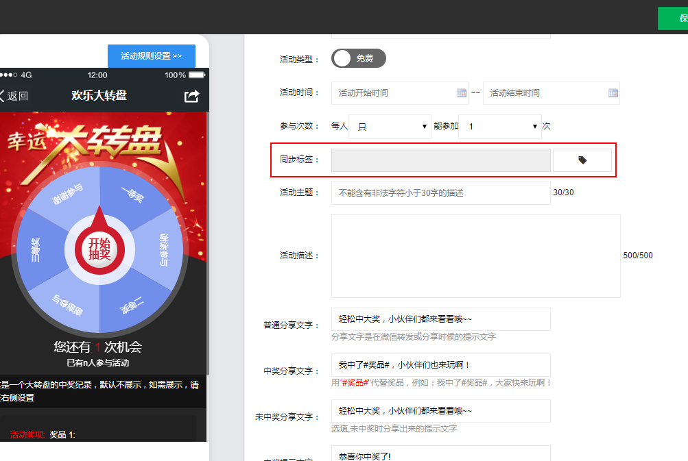 ”的选项,参加大转盘抽奖的粉丝将会打上事先设置好的标签。诸如此类的还有图文素材的二维码、客服资料的二维码、签到功能等等。