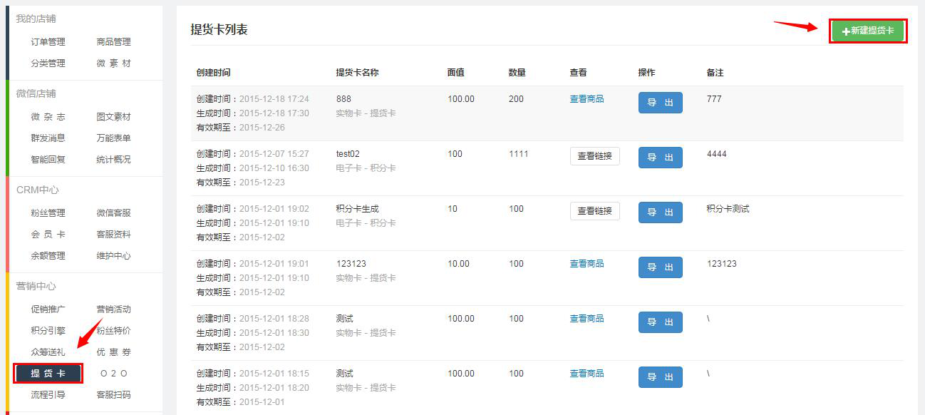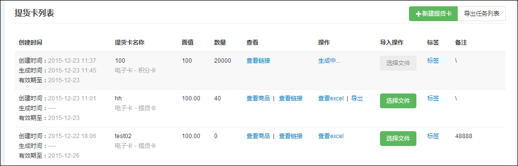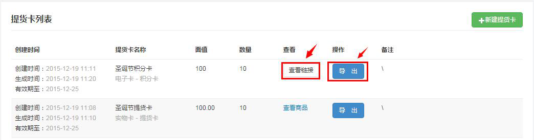 3.积分卡创建成功后,与商品功能卡同理,生成后即可导出或将已有的卡号发放给客户
