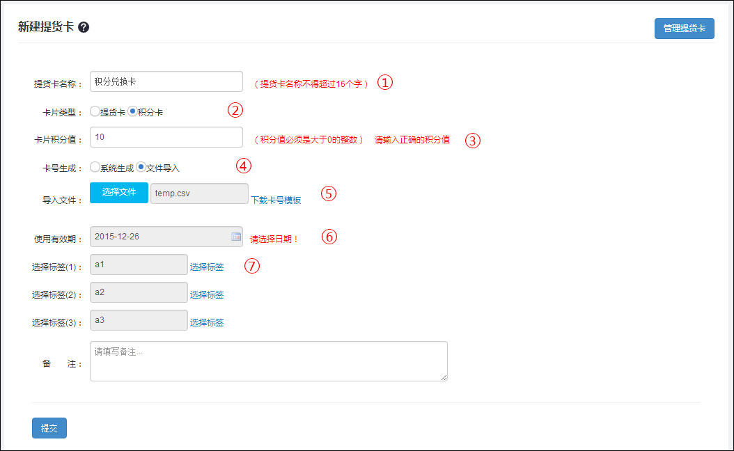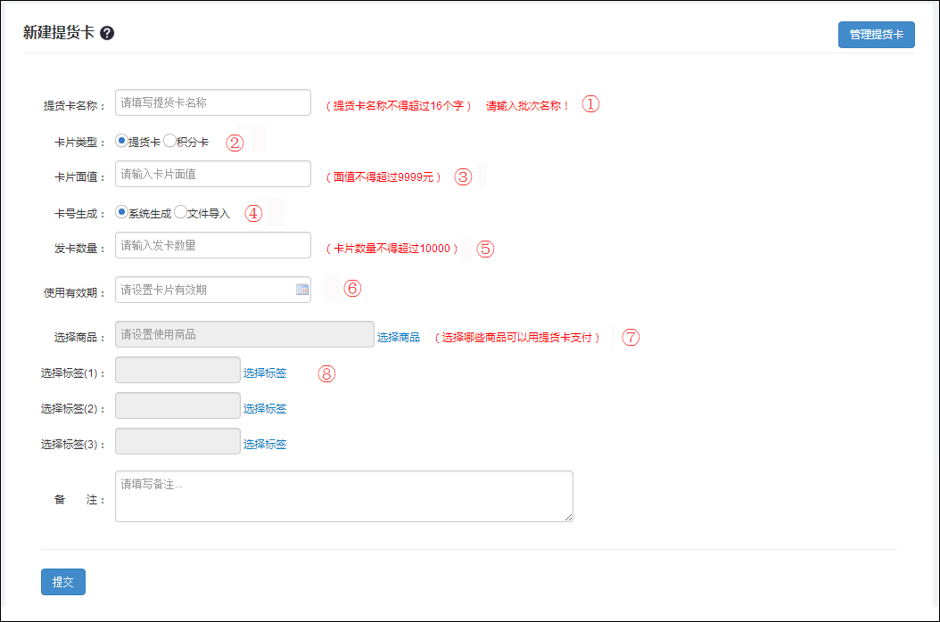 ⑧选择标签,在客户使用该批次卡号兑换商品时,系统可自动打上标签,若存在第二、三次使用,会自动覆盖之前的标签,加上最新的标签,方便商家管理;