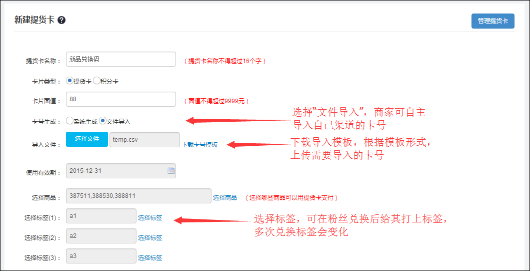 系统自动生成卡号或商家自主导入卡号两种形式;