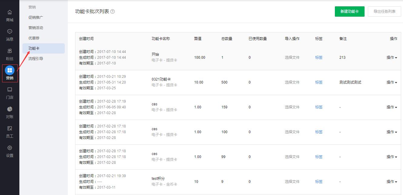1.打开优物库后台营销中心——功能卡,点击“新建功能卡”按钮