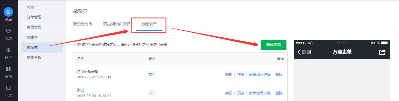 1、进入优物库商家后台,商城——微杂志——万能表单,点击新建表单