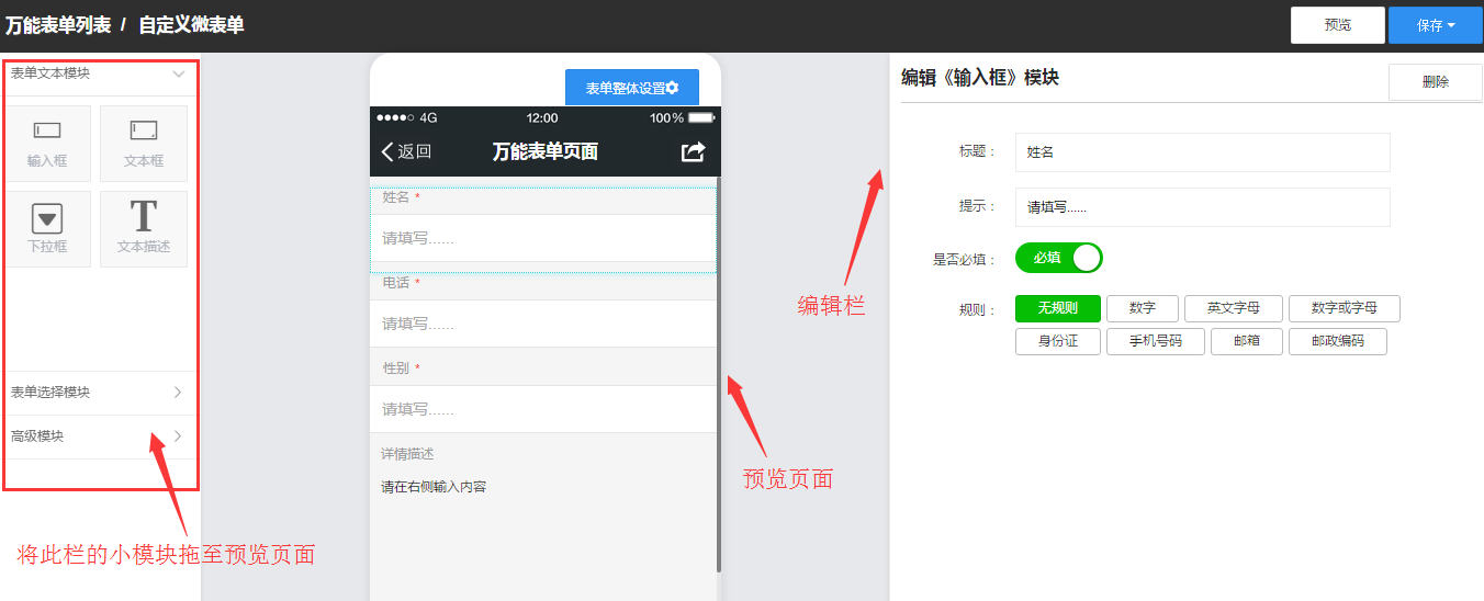 2、根据表单情况,将左侧的模块工具拖至预览页面,在右侧编辑栏编辑表单内容并保存