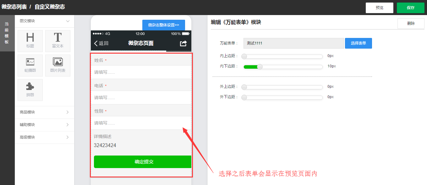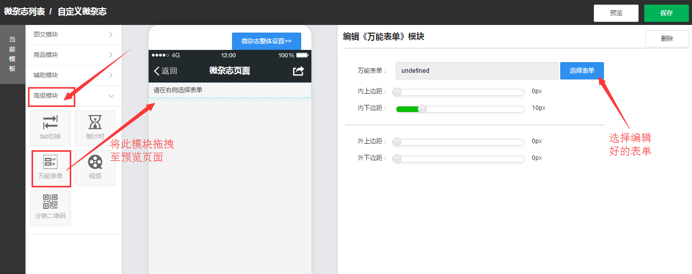 3、编辑好的表单可在微杂志编辑栏高级模块中调出,将万能表单工具模块拖拽至预览页面,在编辑《万能表单》模块处选择需要的表单,确认无误后保存。
