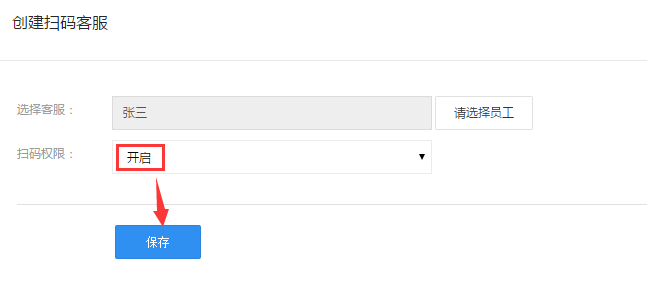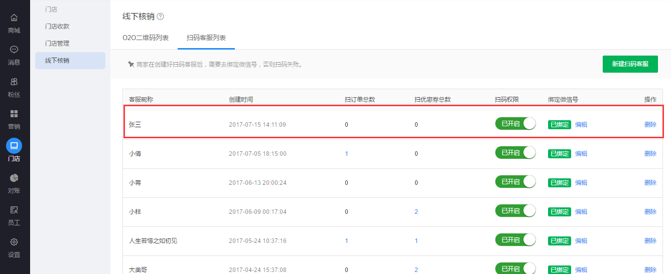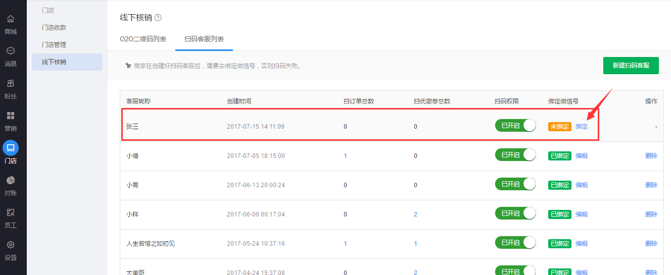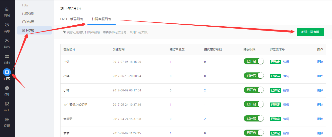 3、进入门店——线下核销——扫码客户列表,点击新建扫码客服,设置有核销权限的客服