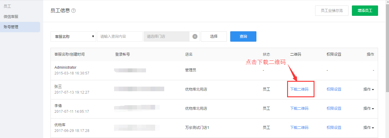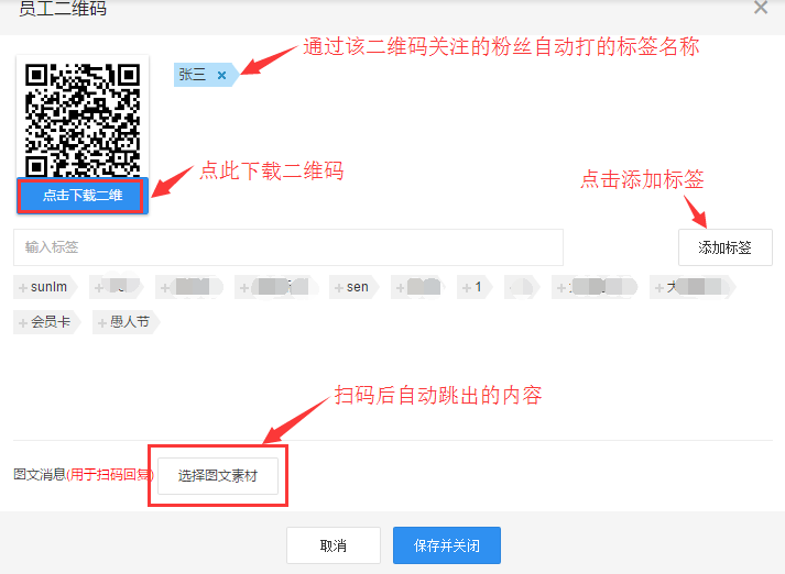(用户通过该二维码关注或购买之后,系统自动打标签、扫码回复等),员工使用此二维码拉粉,同时后台会统计每个员工拉取的