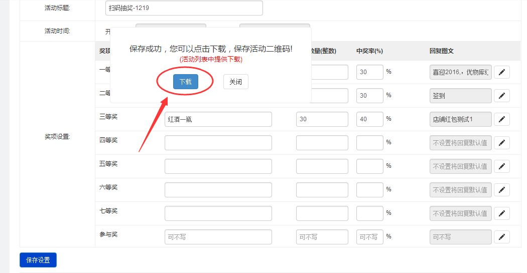 创建好扫码抽奖后,点击保存设置,然后下载活动二维码,该二维码为属性二维码,新粉丝扫码后需要先关注,才可以看到奖项