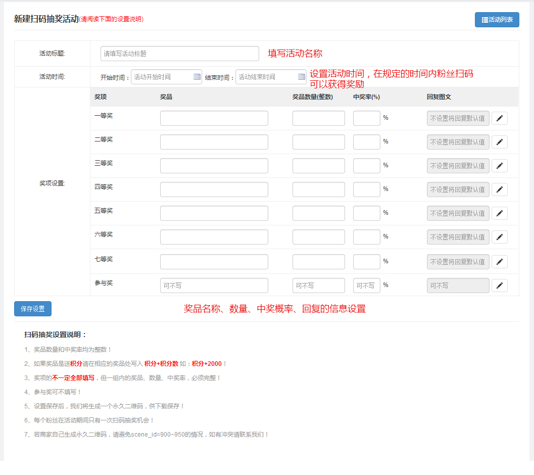 填写活动名称、时间、奖品名称、奖品数量、每个奖品的中奖概率以及扫码中奖后的回复信息