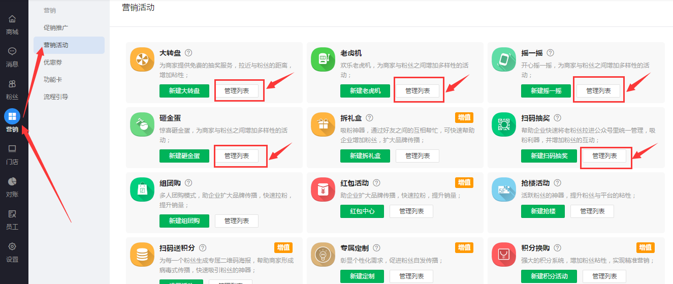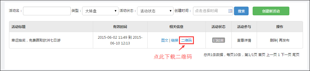 (扫码抽奖多用于线下活动) 等。点击活动相应的“管理列表”可下载活动的二维码;