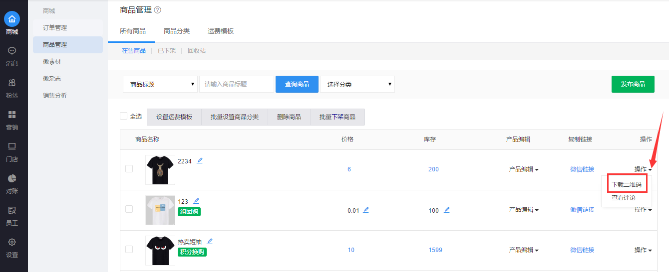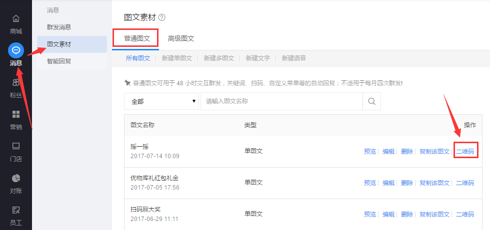 ,即可下载图文素材的二维码。图文素材后期可以更改和编辑,但是二维码会保持不变,方便商家时时更新;