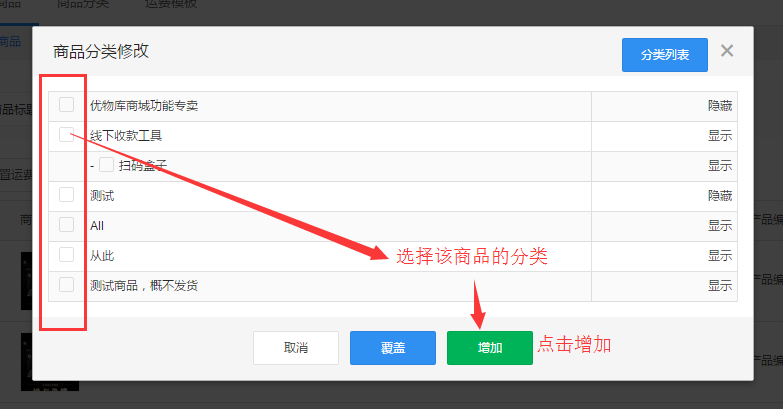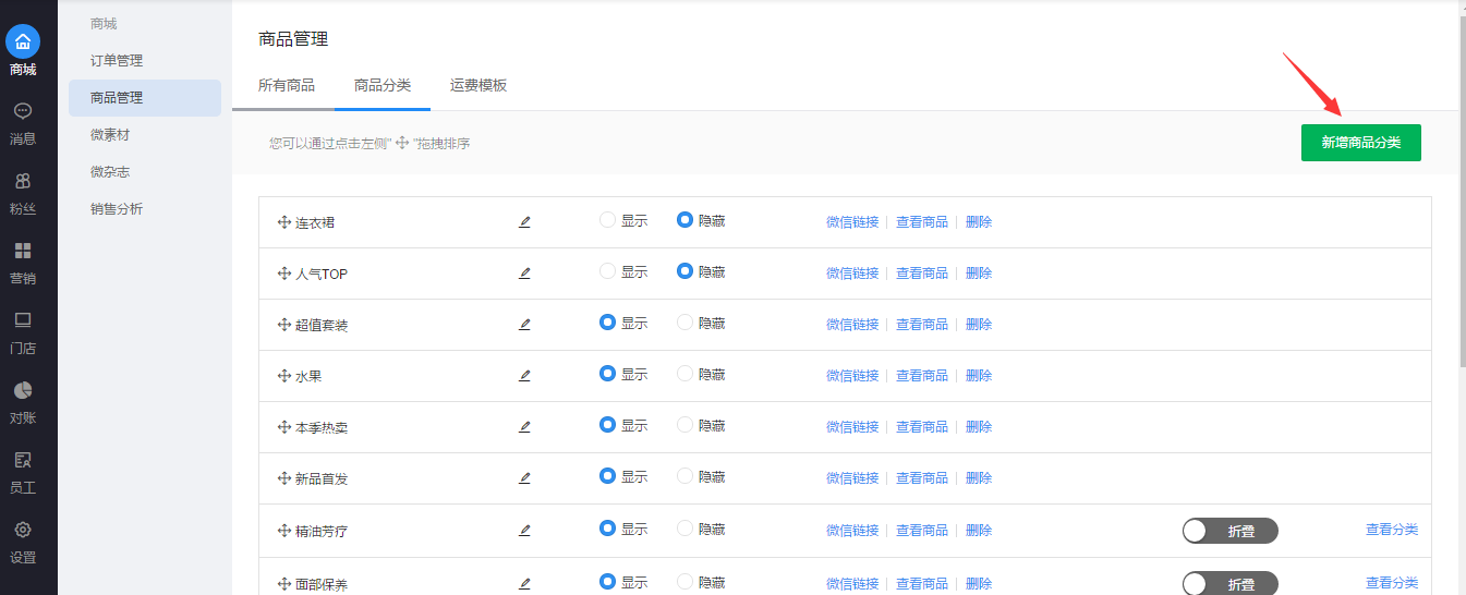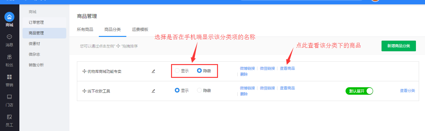 5.此时回到“商品分类”,点击“商品列表”可查看已经在该分类下的商品,点击“显示”、“隐藏”可设置此分类在前端手机页面是否展示给粉丝。