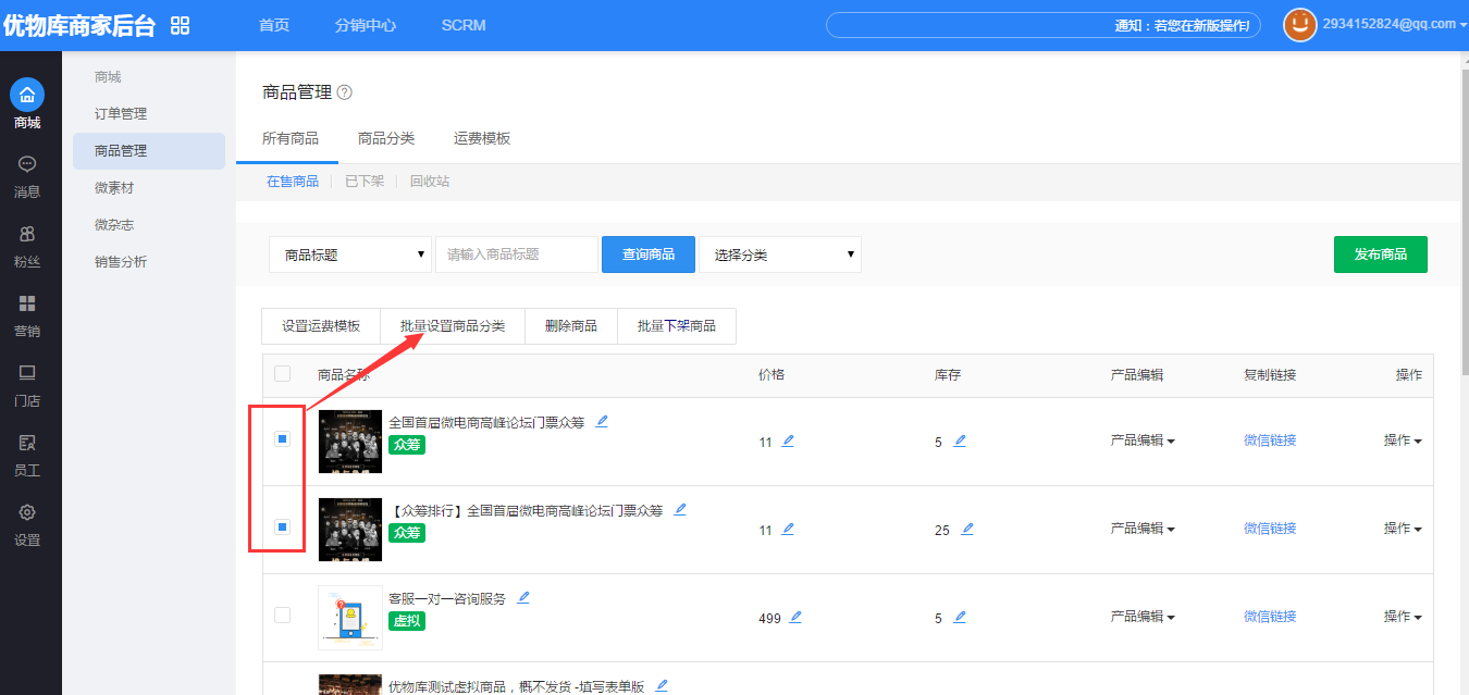 3.打开我的店铺--商品管理,选中需要设置的商品,点击“批量设置商品分类”。
