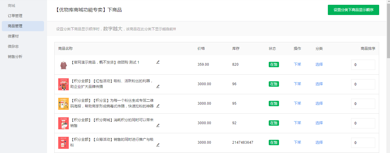 6.在“商品列表”里面可以对该分类下的商品进行相应的操作,如下架商品、更改类别、商品排序