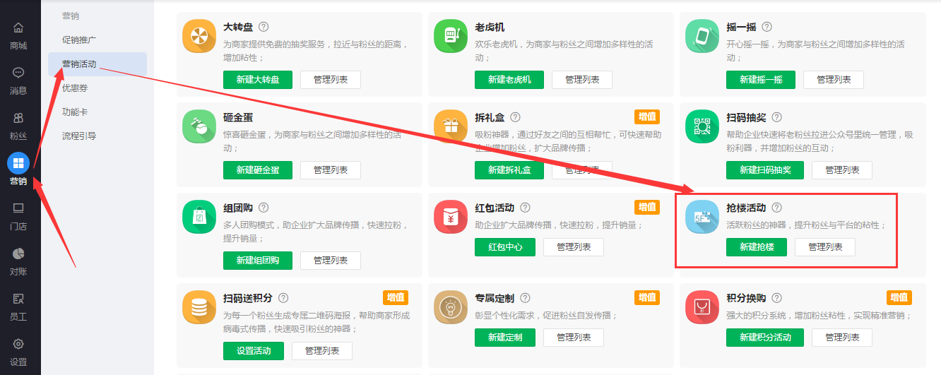 1.打开优物库后台——营销中心——营销活动——抢楼活动,点击“新建抢楼”