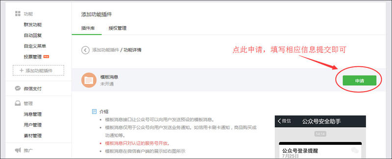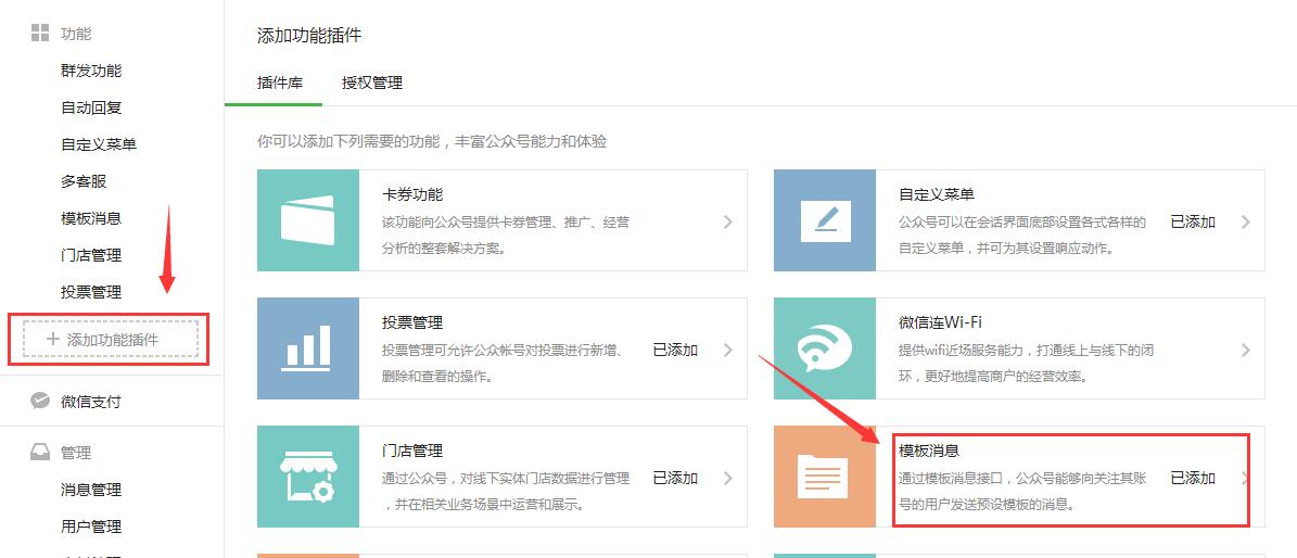 2.如下图,点击“添加功能插件”添加“模板消息”
