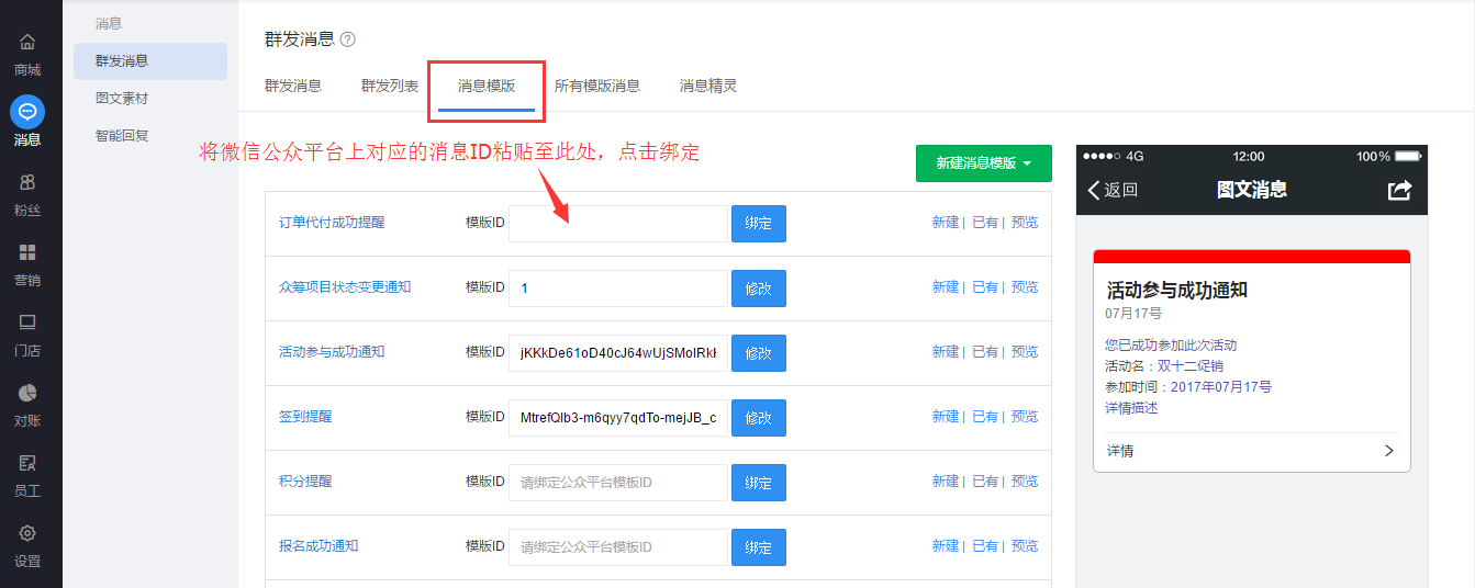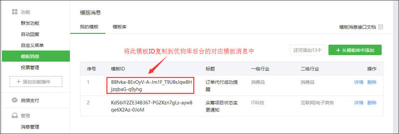 7.登录优物库后台,进入“群发消息”“消息模板”绑定模板ID
