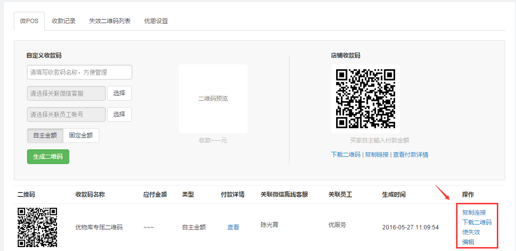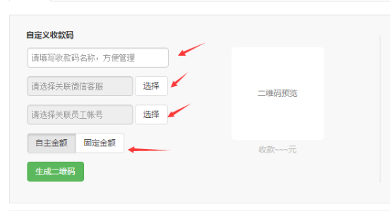 i.填写收款码名称、选择关联微信客服、关联员工、选择收款类型