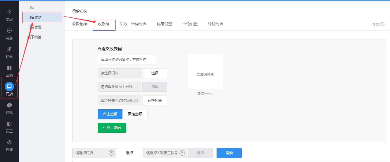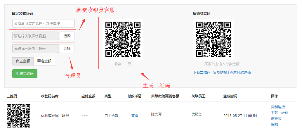 指系统默认为店铺生成的自主金额收款二维码,不与任何员工信息绑定,所收款项通过微信客服值班通知,类似于客户在商城上购物付款一样;